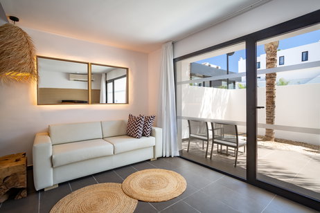 Déjese seducir por la más íntima de nuestras habitaciones. Sus líneas minimalistas le darán la exclusividad que desea para disfrutar de su visita a la Ibiza más cosmopolita. Dormitorio con cama de matrimonio o dos camas individuales según disponibilidad. Salón comedor con sofá-cama convertible en cama de matrimonio. Equipado con cocina completa con vitrocerámica, nevera, microondas, tostadora y hervidor de agua. Baño completo con ducha, espejo tocador y secador de pelo. Televisión de plasma. Aire acondicionado de frío y calor. Caja fuerte. Teléfono directo. Terraza.