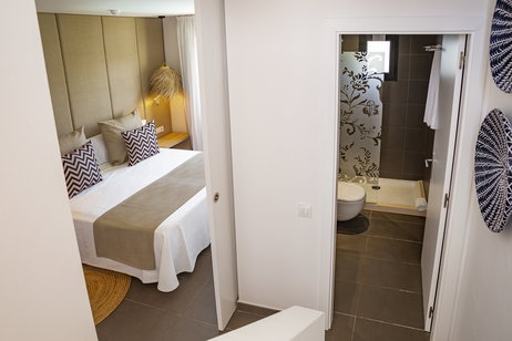 Descanse en una habitación más amplia con terraza privada para disfrutar del sol ibicenco. Esta habitación será la delicia de los que disfruten de sus momentos de intimidad bajo el sol ibicenco además de disfrutar de menú de almohadas, kit de infusiones y café y todos los detalles necesarios para unas vacaciones personalizadas con todas las comodidades. Dormitorio con cama de matrimonio o dos camas individuales según disponibilidad. Carta de almohadas. Solárium. Equipado con cocina completa con vitrocerámica, nevera, microondas, tostadora y hervidor de agua. Baño completo con ducha, espejo tocador y secador de pelo. Albornoz y zapatillas. Salón comedor con sofá-cama convertible en cama de matrimonio. Televisión de plasma. Aire acondicionado de frío y calor. Caja fuerte. Teléfono directo. Servicio de toallas para la playa.